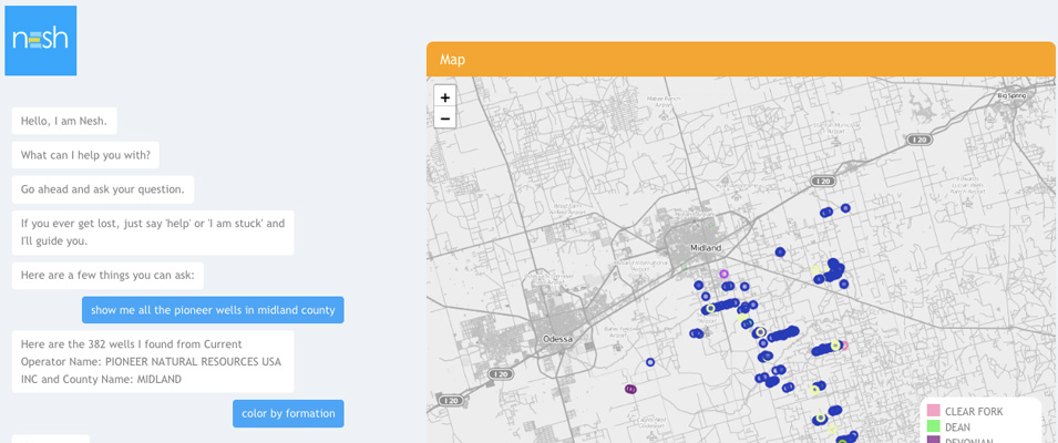 Using Nesh, companies can organize their data (structured and unstructured), run domain-centric analysis on it and get answers effortlessly. We built Nesh using a combination of deep oilfield science (backend) with a simple conversational interface (frontend) to give an Oil and Gas company a tool they can use without any friction. While simplicity is important, the combination of deep science is critical because when drilling or producing a multi-million dollar oilfield, the room for error is small. We took established first-principle petroleum engineering concepts, combined it with automation and ML to handle large datasets with thousands of wells and different production environments, and wrapped it with a layer of technical NLP so that Nesh can understand oilfield jargon. In keeping with our open architecture, we provide an API that empowers our clients and the other software vendors to integrate their own capabilities into Nesh. Before Nesh, users had to be experts in Petroleum Engineering or Geoscience and conversant with the software UI to get their answer. With Nesh, they can get their answers if they simply know how to speak English.