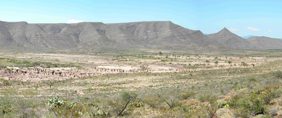 With a great view of the Sierra Madre Oriental, in a sector of the Monterrey Salient, onto the Middle Jurassic salt and carbonates, and the pre-salt red beds at Galeana, Nuevo León México.