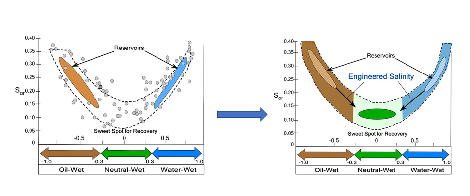 For many reservoirs, wettability can be shifted by changing the salinity. So, you want to test your reservoir to determine what the current wettability is, see if your oil-brine-rock wettability is sensitive to salinity and what salinity gives you the best results.