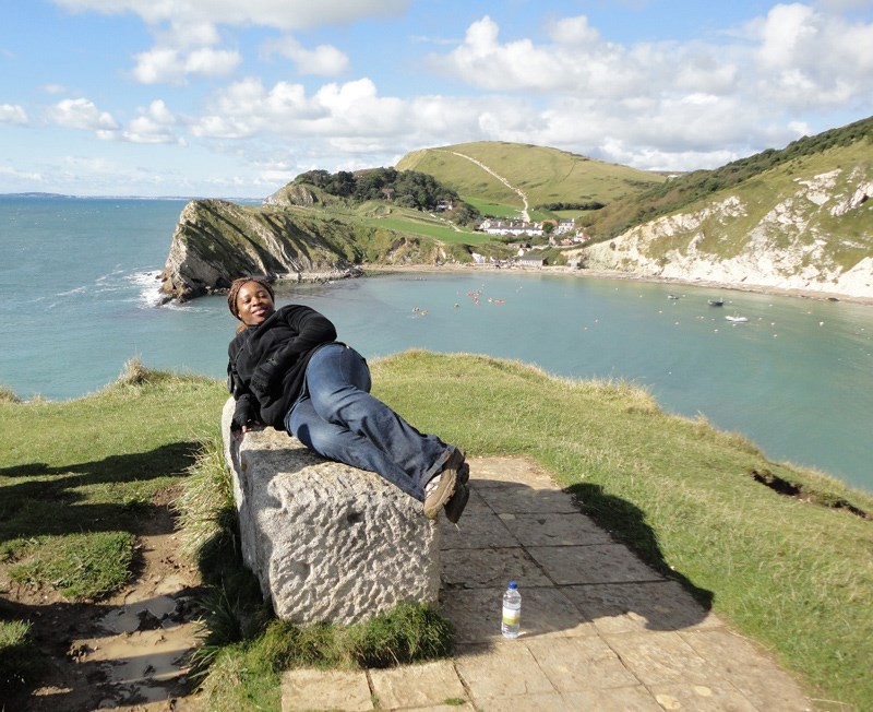 Clara at the Lulworth Cove, Dorset, England. The image is taken from the main path to the cove. The chalk is on the right, the Portland and Purbeck group in the middle, and the Wealden beds to the left.