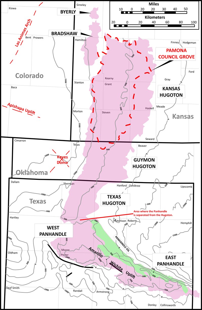 Map of the Texas Panhandle-Hugoton Field in Texas-Oklahoma-Kansas