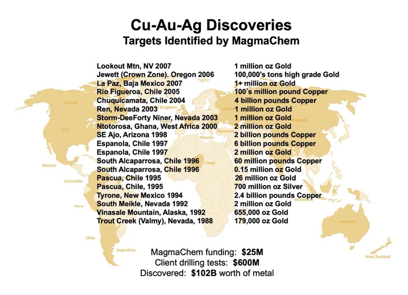 I co-founded MagmaChem Research Institute in 1984 with Stan Keith and we built a client base of more than 100 mineral and petroleum companies, the US Geological Survey, and state surveys. Our research applied to exploration dramatically reduced risk . This led to our targeting of metal systems for mineral industry clients and the discovery of 20 mineral deposits on 3 continents of insitu copper-gold-silver valued at $102 billon in today’s metal prices (Figure1).