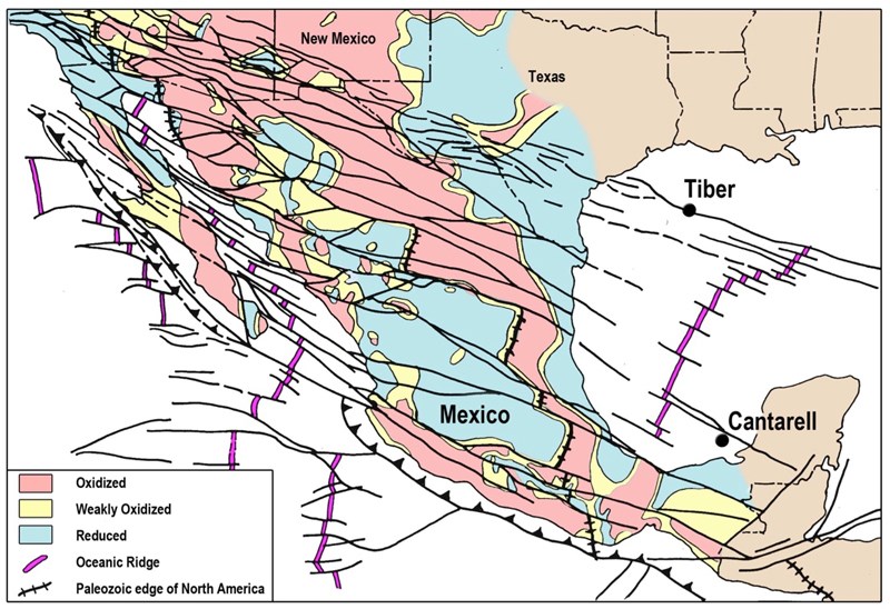 Figure 10: Map of hydrous basement faults of Mexico and oceanic transform faults and fracture zones of the Pacific and the Gulfs of California and Mexico based on chemistry and age dates of igneous rocks, 3000 mineral systems, crustal oxidation state, and the Paleozoic edge of North America,