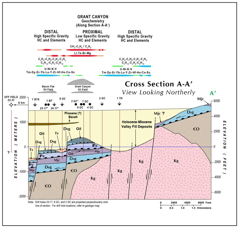 Figure 2: Grant Canyon oil field section based on drill holes and seismic interpretation showing correlation of oil fields with proximal hydrocarbon and multielement surface soil geochemistry.
