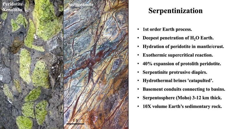 But it wasn't until 2001, after I presented a paper at the AAPG convention in Denver, that we began to look seriously at the sources, migration, and deposition of petroleum systems. Exxon Research told me they had come to this conference to find the answer to one question i.e., "When we do the accounting for supergiant giant oil & gas accumulations the books don't balance. Do you have any idea what we are missing?" They went on to ask, "Why are there metals in oil that seem foreign to oil and where does all the Mg come from for dolomitization?" And said, "Source rocks don't appear to have enough HC to explain the size of super giant oil & gas accumulations and that they had unanswered geodynamics (plate tectonic) questions." Several years later MagmaChem, now MagmaChem Research Institute, discovered a promising answer to the research group's questions: the overlooked Ultra-Deep Hydrothermal (UDH) process of serpentinization, which is the hydration of the igneous rock peridotite under supercritical conditions (Figure 5 and 6).