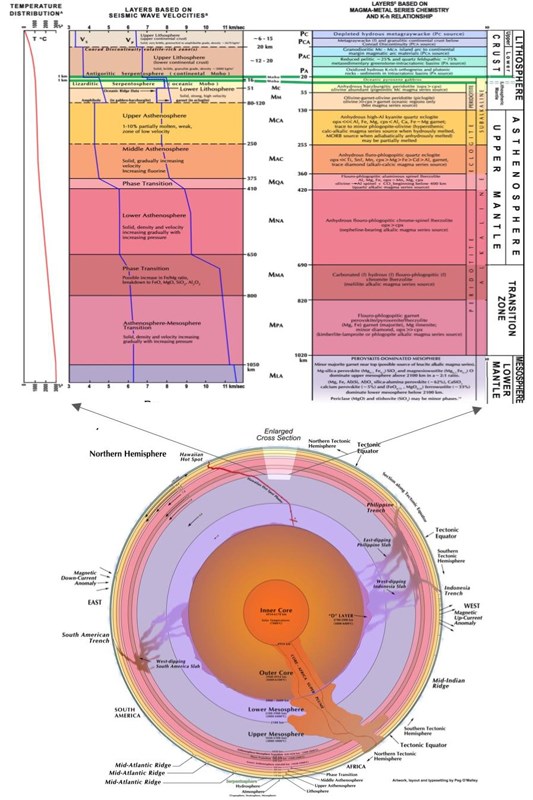 Figure 7: Magma-Metal Series Petrotectonic Model for a Layered Earth showing the chemically distinct and physically immiscible 8 layers of the asthenosphere and transition zone of the mantle.