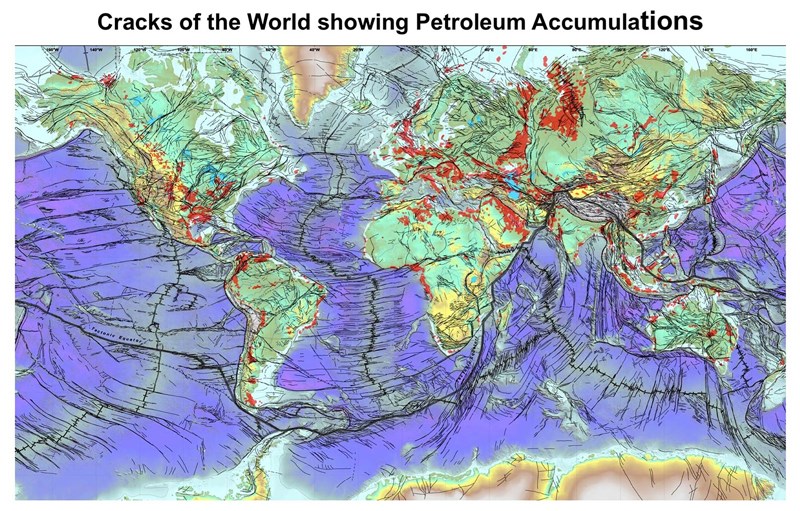 Figure 9: MagmaChem’s Cracks of the World Map based on world-wide BHP's magnetic/gravity maps (Keith et.al., 2003), showing the tectonic equator and oil & gas systems in red