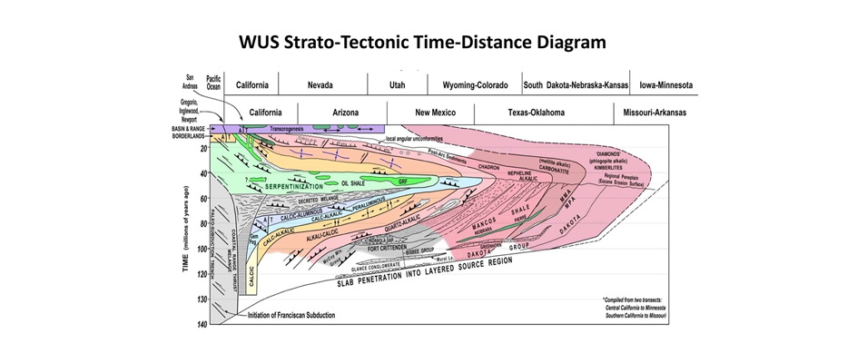Figure 4: Strato-tectonic time-distance diagram for the panel of crust above the Garlock/Gila River oceanic slab segment from California to the mid-continent .