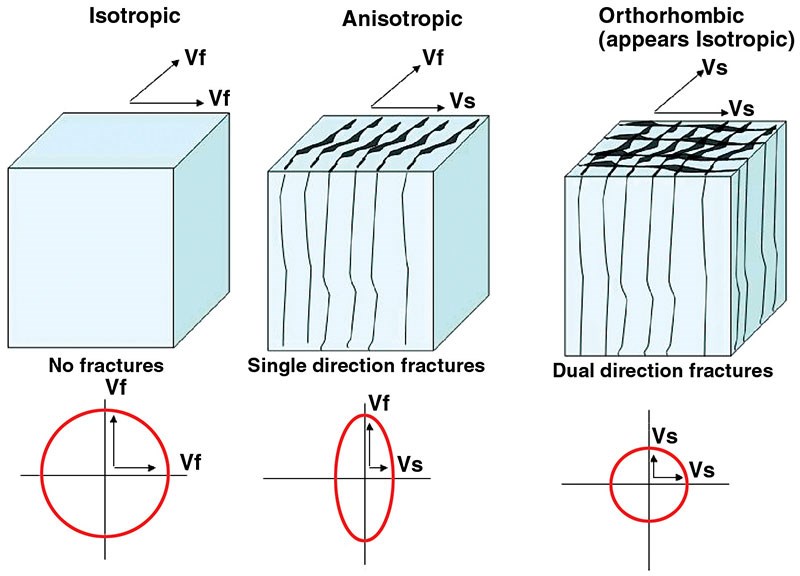 As illustrated in figure 2, seismic wave propagation is minimally affected parallel to the dominant fracture trend in rocks that have a simple one-directional fracture system (the "fast direction," Vfast), but a maximum velocity reduction (the "slow direction," Vslow) is aligned perpendicular to the oriented fractures.