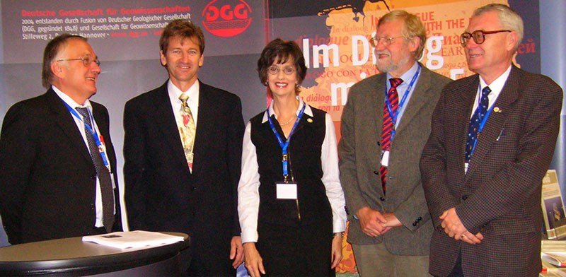 Anniversary time in Aachen: (left to right) Werner Stackebrandt, president, DGG; AAPG President Scott Tinker; AAPG Regions and Sections manager Carol McGowen; Gerold Wefer, president, GV; Istvan Berczi, president, AAPG European Region.
