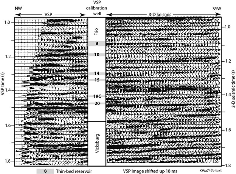 Vertical seismic profile (VSP) data were acquired in a well inside the 3-D image area to define where thin-bed targets – known only as a function of depth from well control – should be positioned in 3-D seismic image space.