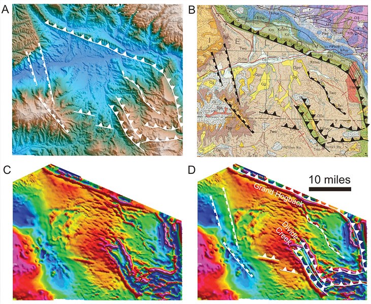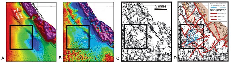 Figure 3 – HRAM data of the Green River Basin (A) reveal the presence of a major wrench fault system that forms the structural edge of the Jonah field. The magnetic expression of faults can be enhanced by either using filtering techniques (B) or by applying a more advance Extended Euler Deconvolution technique (C). This technique detects the faults and fractures in this area which appears to correlate well with faults that were interpreted from 3-D seismic data (shown in blue in D). This example illustrates how HRAM surveys can be used to extend detailed structural interpretation beyond the existing 3-D seismic coverage. Magnetic data sets courtesy of EDCOM-PRJ Inc. and Airmag Surveys Inc.