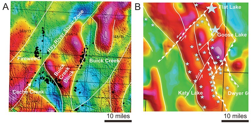 Figure 2 – The control of basement structures on the development of “preferred trends” and “sweet spots” in resource plays is illustrated here with examples from both Canada and the United States. The first example (A) is from the emerging Doig sand play in northeast British Columbia, Canada. In this case, the Doig sand appears to develop along the down thrown side of basement faults. The second example (B) is from the Bakken play in the Williston Basin. In this case, successful Bakken wells appear to be located along the faulted edges of uplifted basement blocks that are cross cut by northeast trending strike slip faults.Data sets courtesy of Fugro Airborne Services