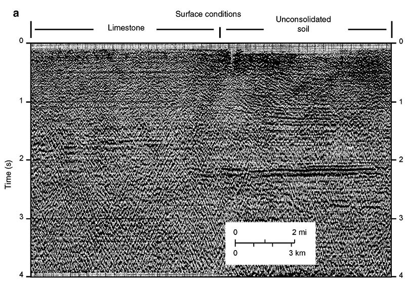 Figure 2 – Comparison of P-wave data (a) and SH data (b) acquired along a profile that traverses a low-velocity Earth surface on the above and a high-velocity surface on the below. The SH data image beneath the exposed carbonate; the P-wave data do not. From Fix and others (1986).