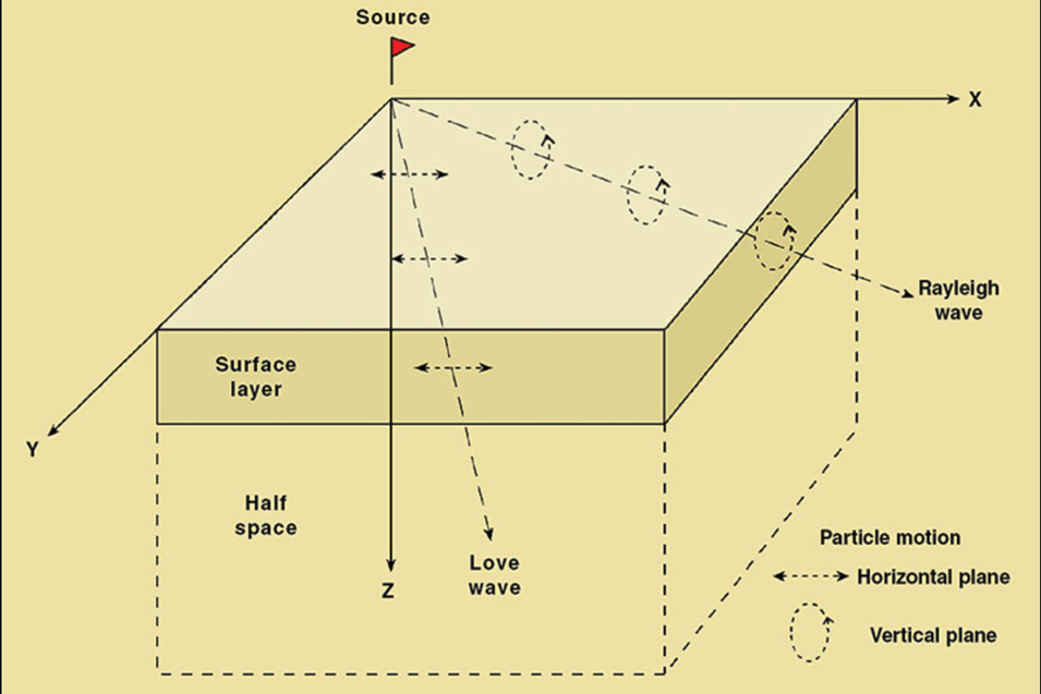 The earth model in Figure 1 will be used to illustrate the wave physics. There are two kinds of surface waves that travel horizontally away from a source station and spread across the earth-air interface: