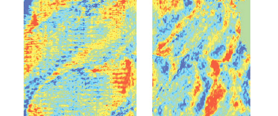Figure 1b is a time slice of data acquired with a mirror zig-zag pattern across an area adjacent to the orthogonal survey displayed in Figure 1a. One feature of this latter image is the absence of an obvious footprint. These examples illustrate that survey design influences the presence or absence of acquisition footprints in seismic data.