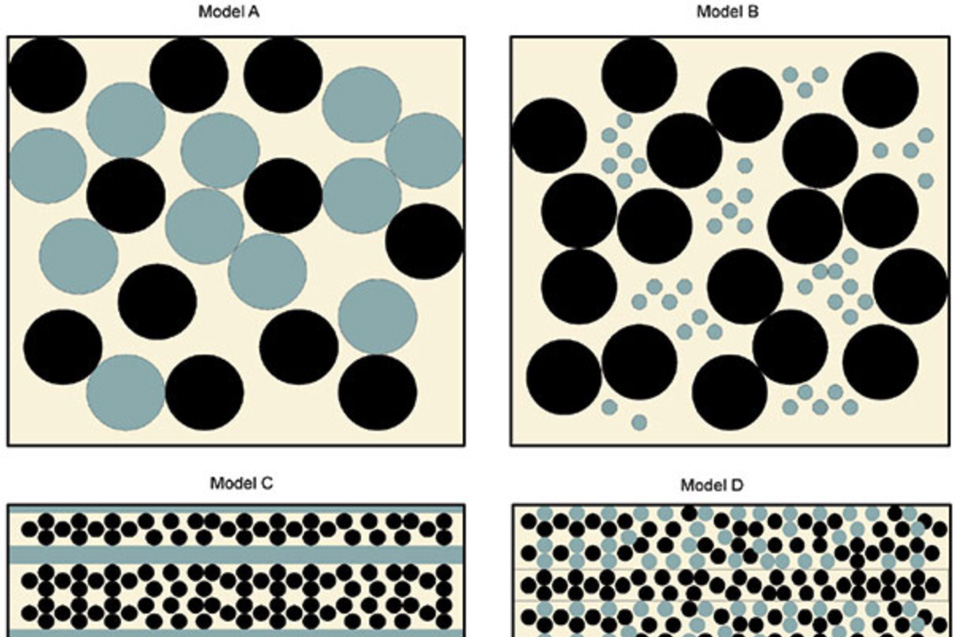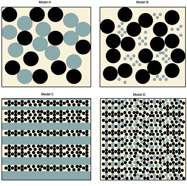 Figure 1 – Four possible models of gas hydrate systems: (A) load-bearing hydrate; (B) pore-filling hydrate; (C) thin layers of pure hydrate intercalated with layers of hydrate-free sediment; (D) thin layers of load-bearing hydrate intercalated with thin layers of hydrate-free sediment. Hydrate is represented in blue, with sediment in black.