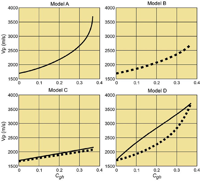 Figure 2 – P-wave velocity VP shown as a function of the volumetric fraction of hydrate (Cgh) in deepwater sediment for each of the four hydrate-sediment models illustrated in figure 1. Layer Models C and D allow both a slow mode (dashed curve) and a fast mode (solid curve) to propagate. Sediment porosity is assumed to be 0.37, and the effective pressure is set at 0.01MPa.