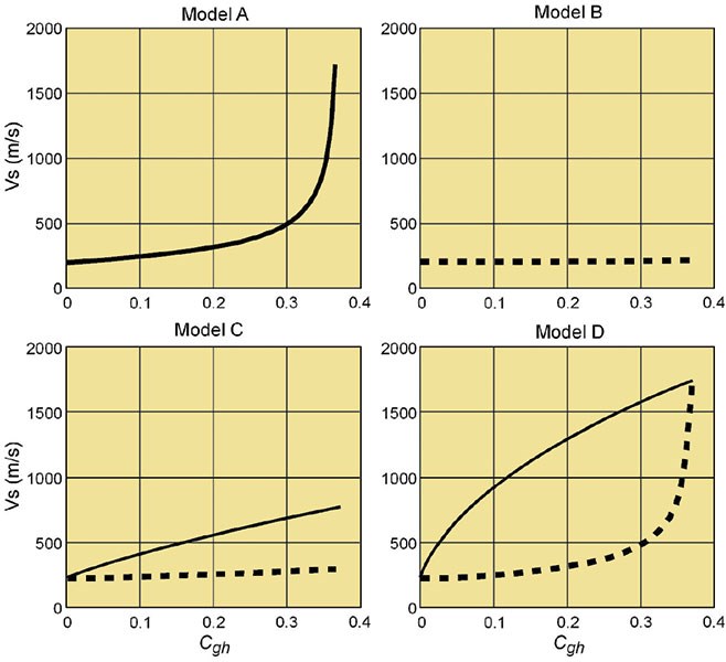 Figure 3 – S-wave velocity VS shown as a function of the volumetric fraction of hydrate (Cgh) in deepwater sediment for each of the four hydrate-sediment models illustrated in figure 1. Layer Models C and D allow both a slow mode (dashed curve) and a fast mode (solid curve) to propagate. Sediment porosity is defined to be 0.37, and effective pressure is assumed to be 0.01 MPa.