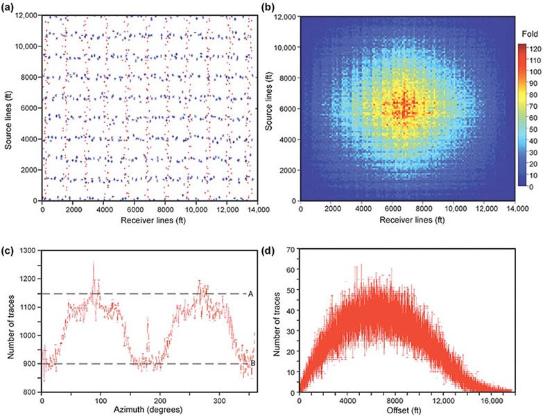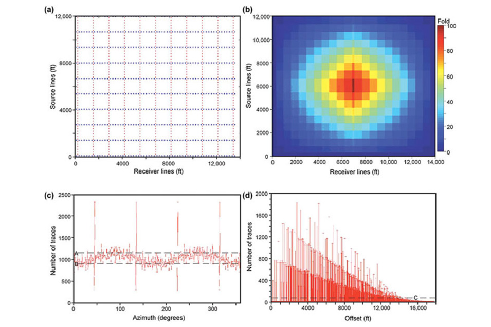 Figure 2 – (a) The same data-acquisition grid as in figure 1, but with source and receiver stations positioned at irregular, random coordinates. (b) Stacking fold. (c, d) Offset and azimuth distributions have minor outliers and are less erratic than the distributions in figure 1. The data in c fit between values A and B in figure 1c; the data in d fit below line C in figure 1d.