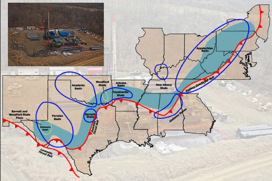 Several aerial views of a frac job at one of Range Resources Devonian shale plays in Pennsylvania -- these are among the first large, slick water fracs applied to shales in the Appalachian Basin. Resources Devonian . Photos courtesy of Range Resources; map data courtesy of Chesapeake Energy.