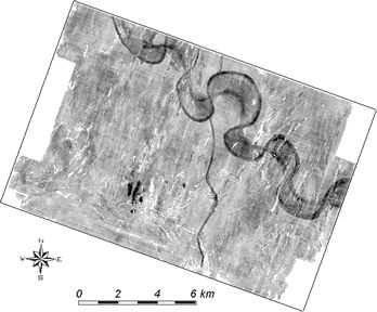 The width of the principal trunk valley is about three to four kilometers in the north widening to five kilometers in the south. A single channel that bifurcates in places and is characterized by low sinuosity dominates the trunk system.