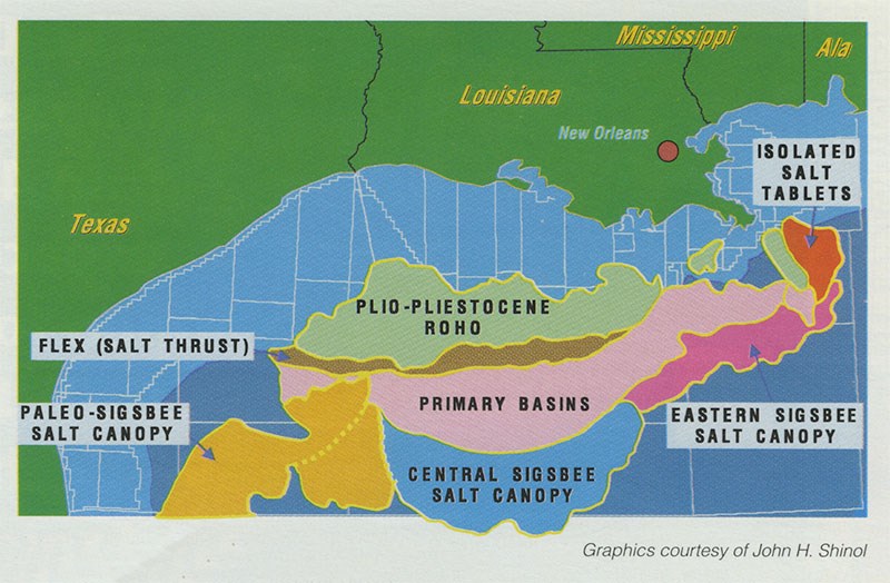 In a presentation at last April's AAPG annual meeting in New Orleans, John H. Shinol, senior advising geophysicist for deep water exploration with Unocal's Spirit Energy unit, discussed the deep water subsalt potential. His paper ("Subsalt Exploration in the Gulf of Mexico Deep Water," co-authored with H. Scott Sumner and J. Tim Ford) outlined four of the major provinces in the deep water subsalt play based on geological, geophysical and associated petroleum system attributes.