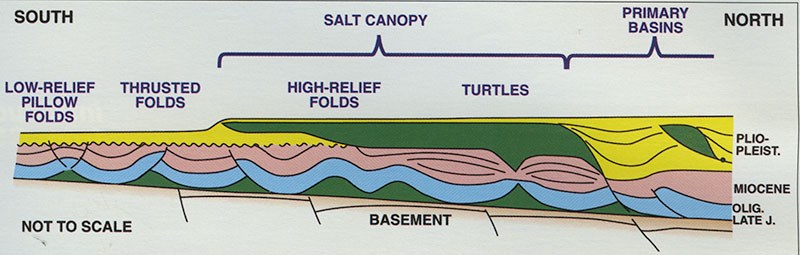 "We think the northwest to southeast folds are related to one of the large transform fault zones in the area that probably had heavy control on the original salt thickness," he added. "So, we have a northwest-southeast running transform fault with thick salt to the northeast of it and thinner salt to the southwest. That thicker salt deformed more easily and the transform fault acted as a buttress to keep things pinned.