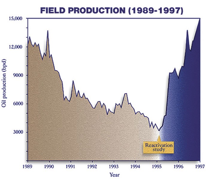 Integrated reservoir characterization, according to one team of geoscientists, is a proven boost to field production, as evidenced by the chart below. Graphics courtesy of Roger Tyler.