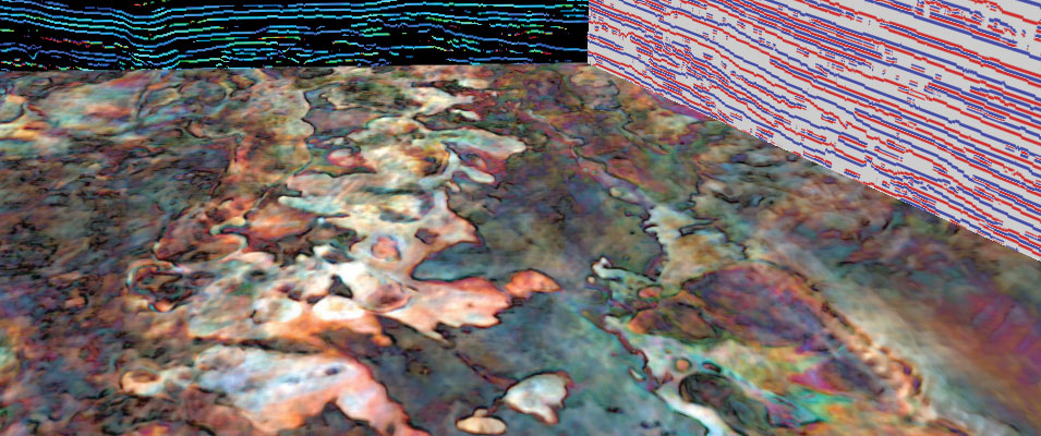 Using colors to provide geoscientists with a new tool for trap and reservoir prediction: RGB frequency blend reveals casrbonate reef geometries. Graphics courtesy of ffA GeoTeric