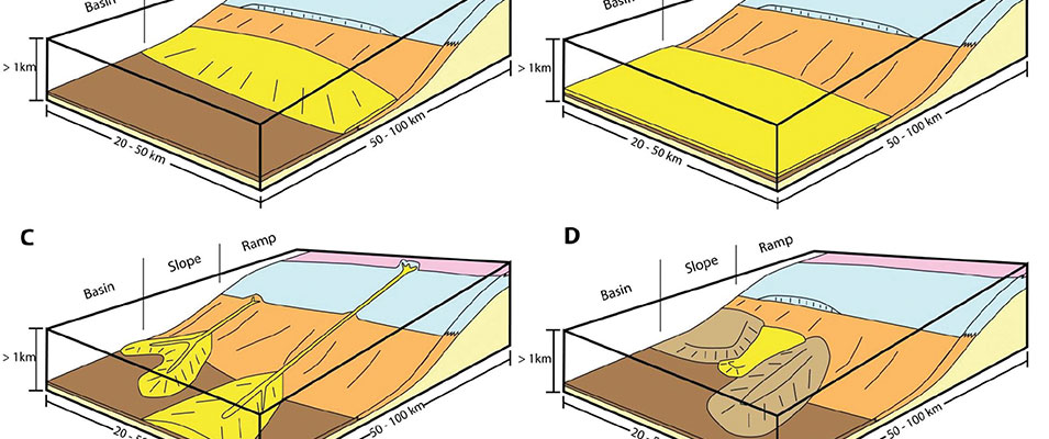 Using hundreds of well logs and data from cores, the team learned that many carbonates likely were deposited via SGFs, when carbonate platforms or ramps that surrounded the basin gave rise to apron, sheet, fan and linear geobodies in the basin center.