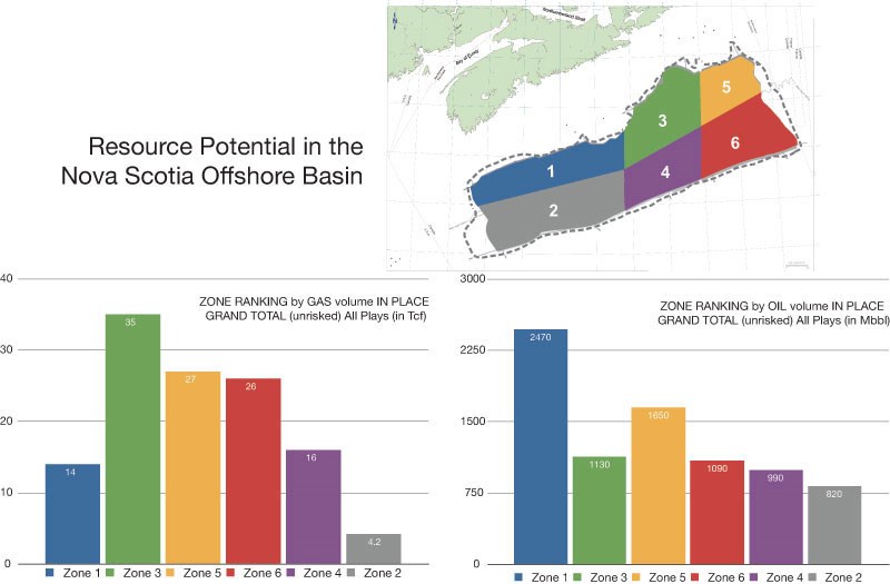 Scotian Basin map and data showing the resource potential of the six geographical zones for Play Fairway Analysis of the Scotian Basin.