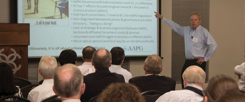 Past AAPG president Lee Krystinik headed the committee and presented the findings of an effort that had been under way for more than a year by committee members representing each of the three AAPG governance bodies (Executive Committee, Advisory Council and the House of Delegates).