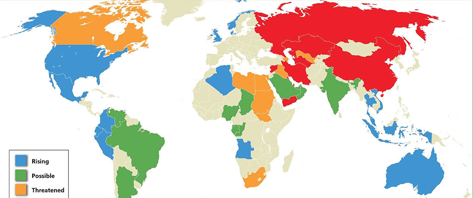 Rising countries include: the United States, Mexico, Colombia, Ecuador, Peru, Australia, Indonesia, Vietnam, Thailand, Angola, Algeria, United Kingdom, Norway and Denmark.