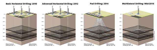 Five years ago, wells went down a mile and extended laterally by 600 feet. Two years later, they reached out a mile. “That’s a ten time increase in drilling capacity per pad,” he said. “Then they started combining surface infrastructure, and you have upwards of 20 straws going into the ground in the same place. Your surface costs have now dropped about three-quarters.”