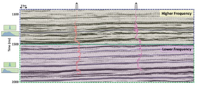 The frequency content of surface seismic data varies with time due to attenuation or other effects, so generally we see higher frequencies in shallow intervals that are gradually lowered with increasing times. In figure 1 we show a seismic section over a 1s interval, but higher frequencies in the upper 500ms and lower frequencies in the lower 500ms are seen. This can be seen on the wavelets that are extracted in the upper and lower intervals and the frequency spectra generated for the two intervals, as shown in the insets.