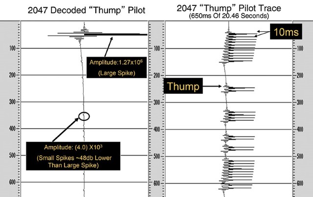 “But with thumps, you’re actually trying to make the vibrator hit the ground like a hammer hit, similar to what a dynamite source would be, but the vibrator hits with very small force,” Thomas said. “Thumps are short duration vibroseis pulses lasting about five milliseconds (ms).