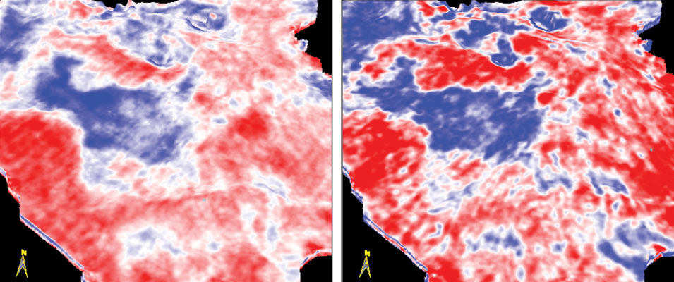 In figure 1 we show a comparison of stratal slices through the seismic data (figure 1a) and 40 Hz spectral decomposition volumes (figure 1b). The stratal slices were chosen 16 ms below a marker seismic reflector close to 950 ms on seismic data processed with 5-D interpolation used to regularize offsets and azimuths.