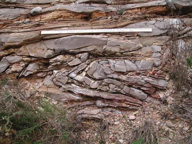 - The lowest member consists of unstable slope strata, including debris flows, slump folds and breccias, possible turbidites and contourites.