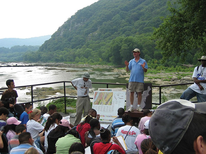 U.S. Geological Survey geologists give ninth grade GeoFORCE students a lesson on the geology at Harpers Ferry, West Virginia.