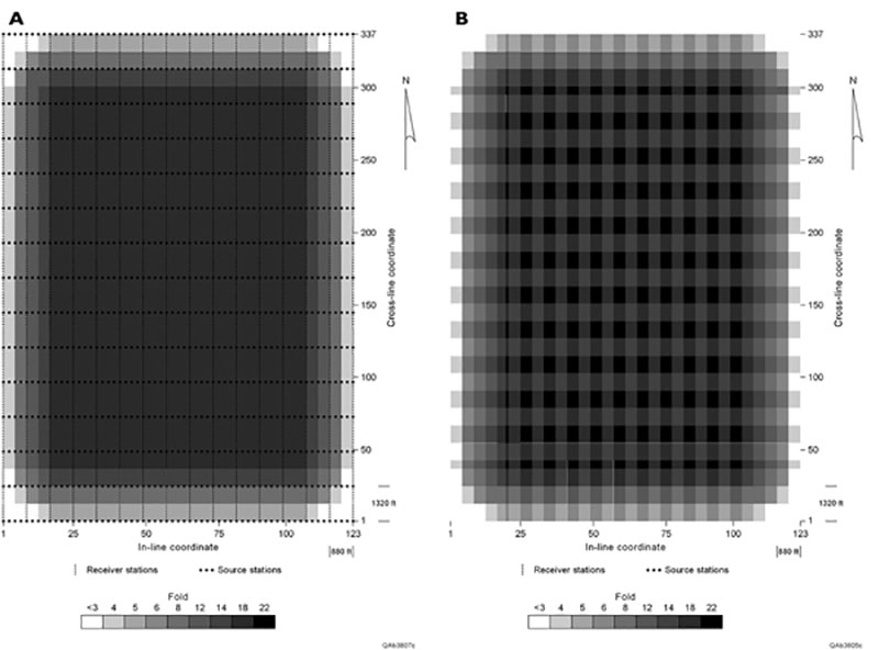Because of these geometrical constraints, swath A creates whole number values of four and five for stacking fold parameters FIL and FXL, respectively, and a uniform stacking fold of 20 across the 3-D grid. In contrast, swath B creates fractional (non-integer) values for in-line, cross-line and 3-D stacking folds.