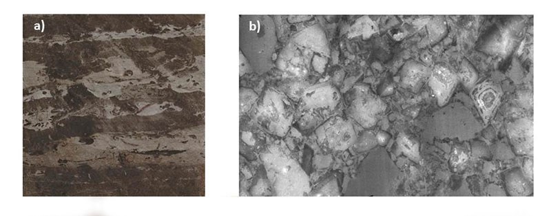 Photo a: A slabbed core photo (three inches across) showing the main Pronghorn pay facies is burrowed detrital dolomitic siltstone with finer grained rippled interbeds (light colored beds). Photo b: The SEM image of the main pay facies shows common zoned dolomite grains with rounded detrital dolomite cores. Dark gray grains are quartz.