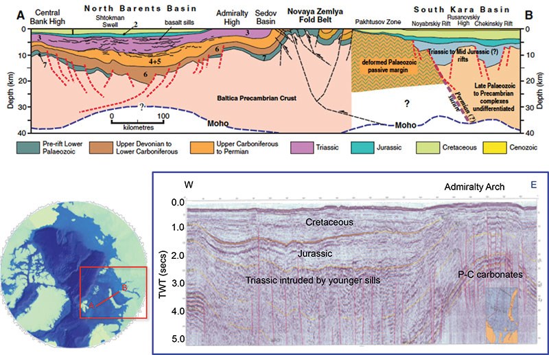 The West Siberian Basin and its offshore portions in the south Kara Sea are among earth’s most prolific petroleum basins, with greater than 400 billion bbls(OE). It is an intracratonic basin that has evolved from Triassic to Tertiary. Note the progressive deepening of the late Jurassic source rock from south to north (Urengoy) and shallowing again into the south Kara Sea, which is likely to become a major oil and gas province over the next few decades.