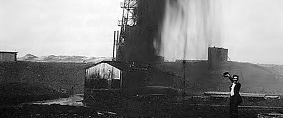 At 3 a.m., the drillers pulled up the drilling bit to clean out the well hole. Gas and oil, escaping from the punctured limestone below, rushed up the hole and spurted over the crown of the derrick to a height of 140 feet, drenching everything in a torrent of black rain.