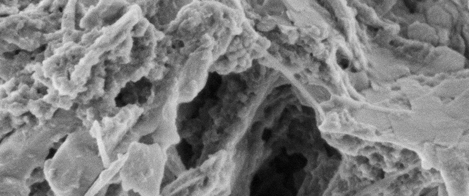 This image of pores in an unconventional reservoir in South America shows mineral surfaces interpreted as clay (on right) and calcite (on lower left) surrounded by porous organic matter with variable pore sizes. The mineral surfaces are largely uncoated in asphaltenes and water-wet, while the organic pore network at this level of maturity (oil window) is hydrophobic and considered oil-wet. This is a secondary electron image of a freshly broken surface, courtesy of Andrew Fogden.