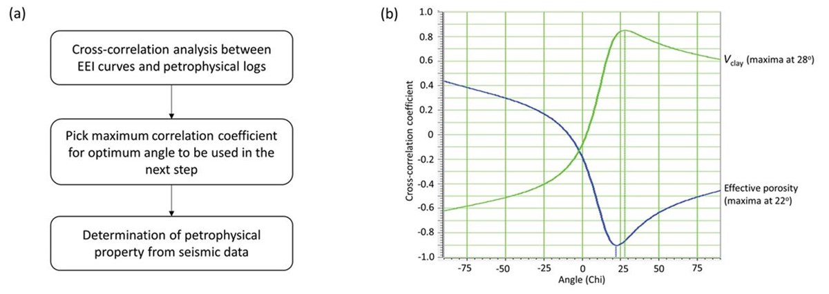 Figure 1: (a) Workflow for extended elastic impedance (EEI) approach for predicting the volume of petrophysical properties from seismic data. (b) Cross-correlation analysis for effective porosity (blue curve) and Vclay (green curve) with EEI curves. A maximum negative correlation is seen for effective porosity at 28 degrees, and a maximum positive correlation is seen for Vclay at 22 degrees.