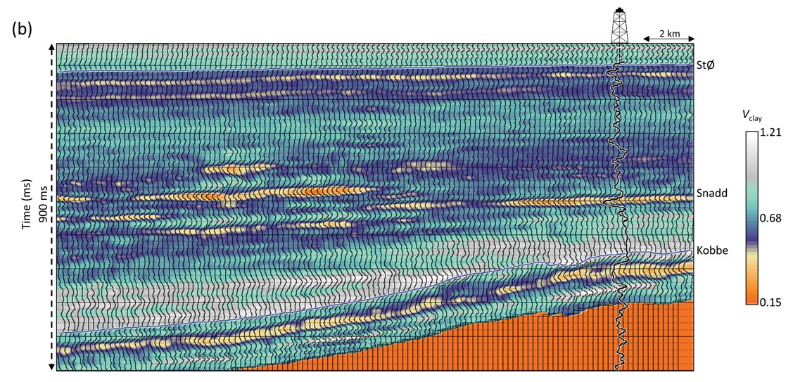 We take this analysis further and crossplot effective porosity and Vclay derived attributes as shown in figure 3a. Next, we enclose the cluster of points that exhibit high porosity and low values, or not-so-high values of Vclay with red, green and blue polygons, and back-project them on the vertical seismic. The latter step helps us understand where these cluster of points are coming from in the different zones of interest. In figure 3b we see the differentiation of the potential reservoirs within the three formations of interest, namely the StØ , Snadd and Kobbe formations.