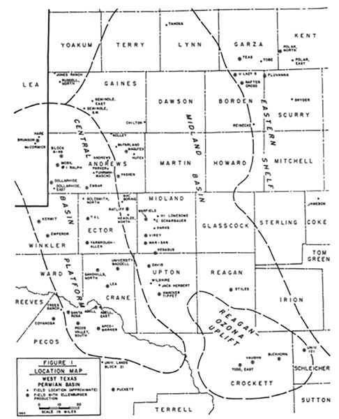 Map of the locations of wells in the Permian basin of West Texas and eastern New Mexico from which crude oil samples were obtained for measurement of carbon isotopic compositions.