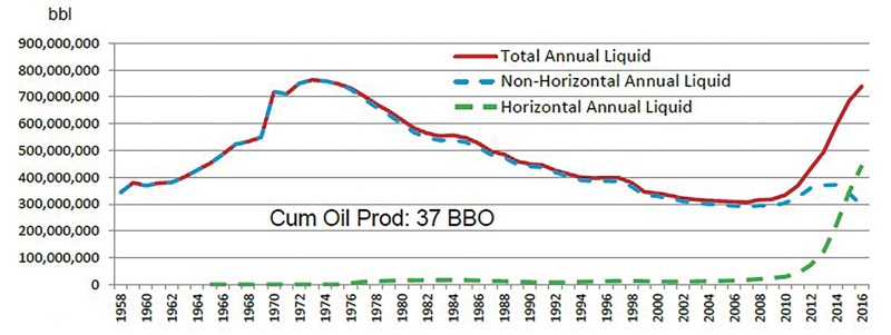 Production shot upward and eventually passed 2 million barrels per day, easily besting the 1976 peak. Estimated remaining recoverable reserves of over 80 billion barrels are more than twice the basin’s cumulative production to date.