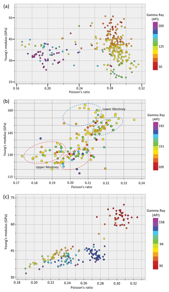 Figure 2: shows the Young's modulus and Poisson's ratio curves for well data from (a) Duvernay shale in Kaybob area in central Alberta, Canada, (b) Montney shale in British Columbia, Canada, and (c) Utica shale from eastern Ohio, US. Notice a crossover between them only for Upper Montney. Such a crossover is not seen for the Duvernay and Utica shale intervals. The crossplots between Young's modulus and Poisson's ratio for well data shown in Figure 2 are shown in Figure 3 (below).
